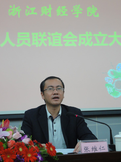 张维仁副主席代表浙江省侨联、留联会对浙财留联会的成立表示祝贺。他说,此举是落实中央和省委关于人才工作精神的生动实践,同时我校又是全省第100家成立留联组织的单位,对于推进省侨联、留联会规范化建设、扩大组织覆盖面具有重要意义。他希望浙财留联会自觉接受校党委的领导,围绕“三个服务”,即为学校建设发展服务、为地方经济社会服务、为各位会员服务开展工作,为促进省侨联、留联会工作进一步发展,为建设“两富”现代化浙江作出积极贡献。