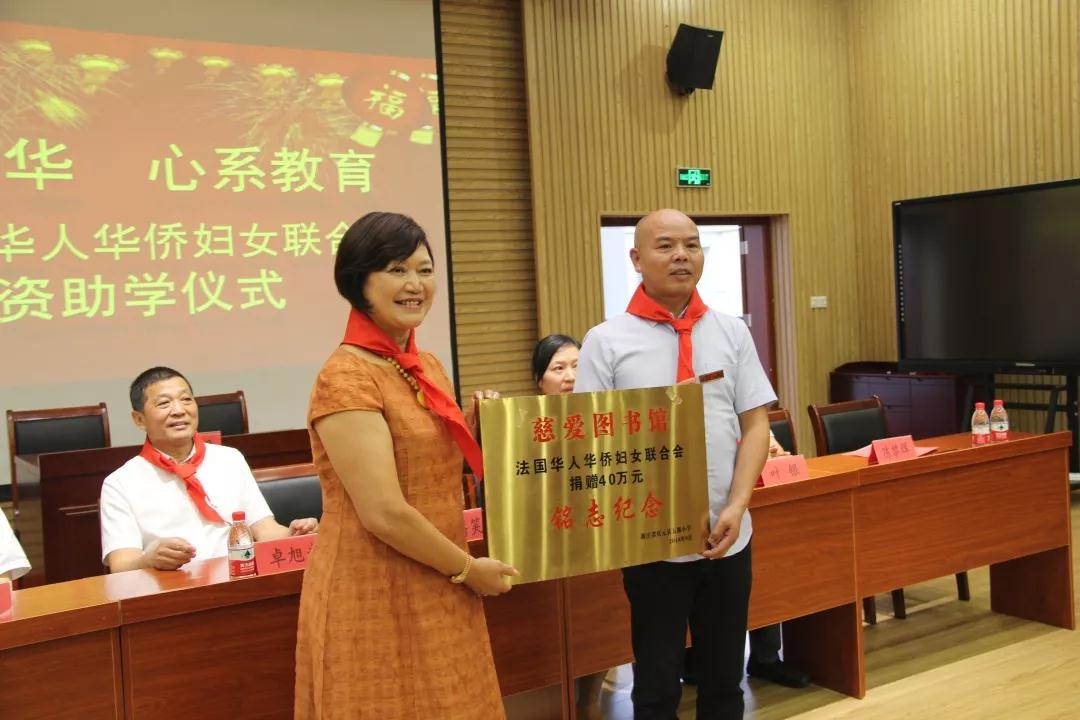 法国华人华侨妇女联合会长潘笑黎为“慈爱图书馆”揭牌