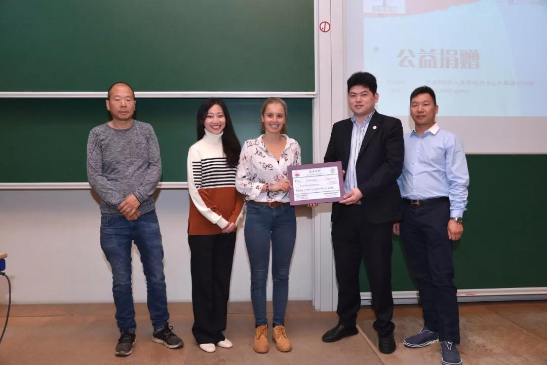 向“布鲁塞尔难民”公益组织捐赠2000欧元。左起:季天迅,顾昱雯,受赠方代表,朱旭林,张敏毅