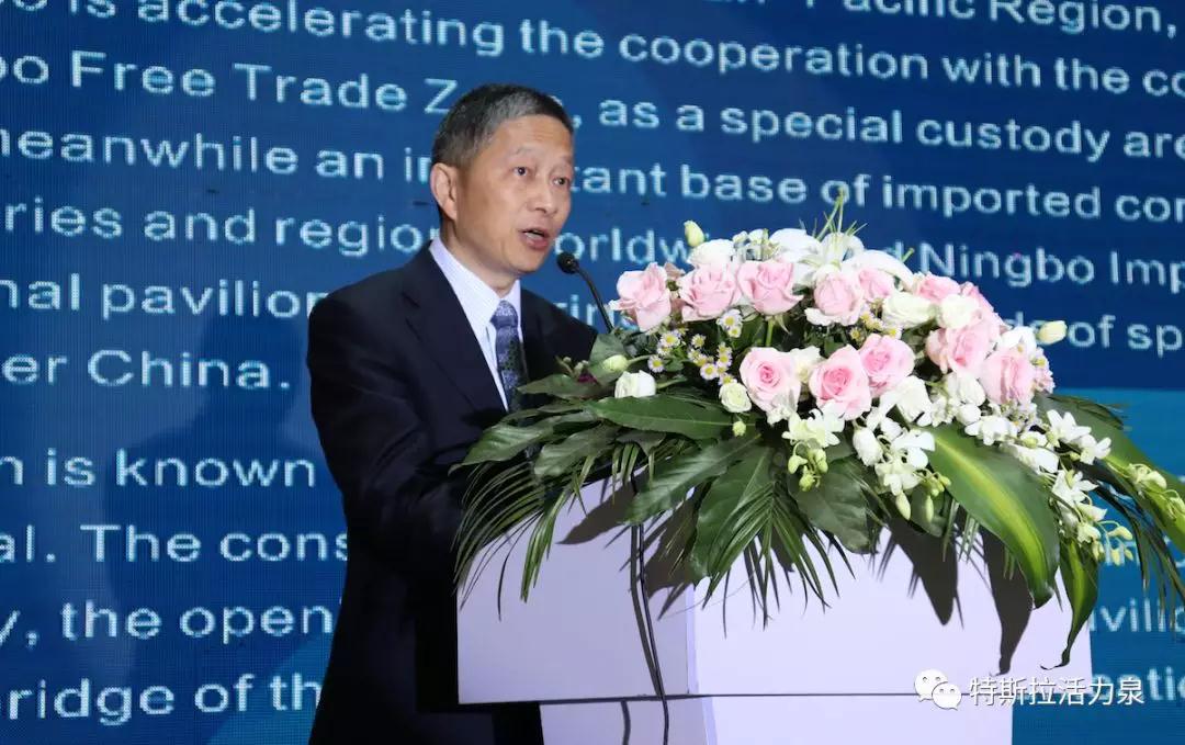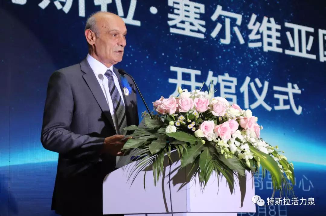 宁波保税区管委会副主任党工委副书记陆志孟先生致辞,他幽默又友好地祝愿特斯拉塞尔维亚国家馆生意兴隆,当好中塞两国文化沟通、经贸往来的桥梁!