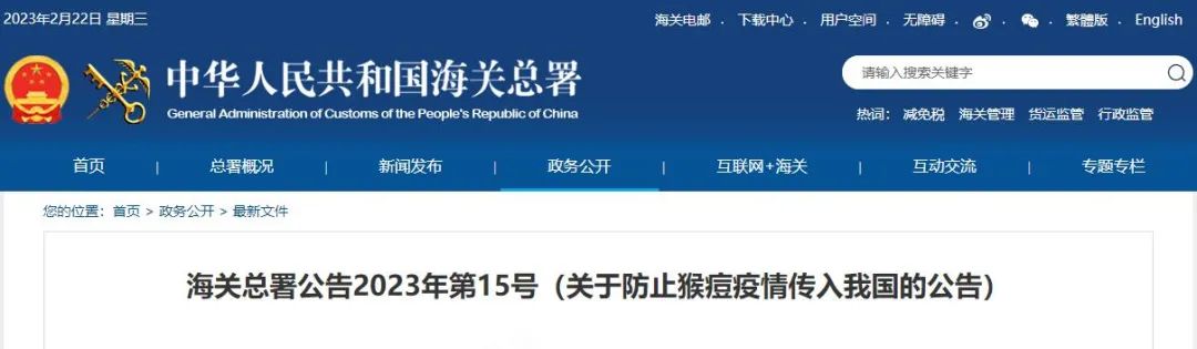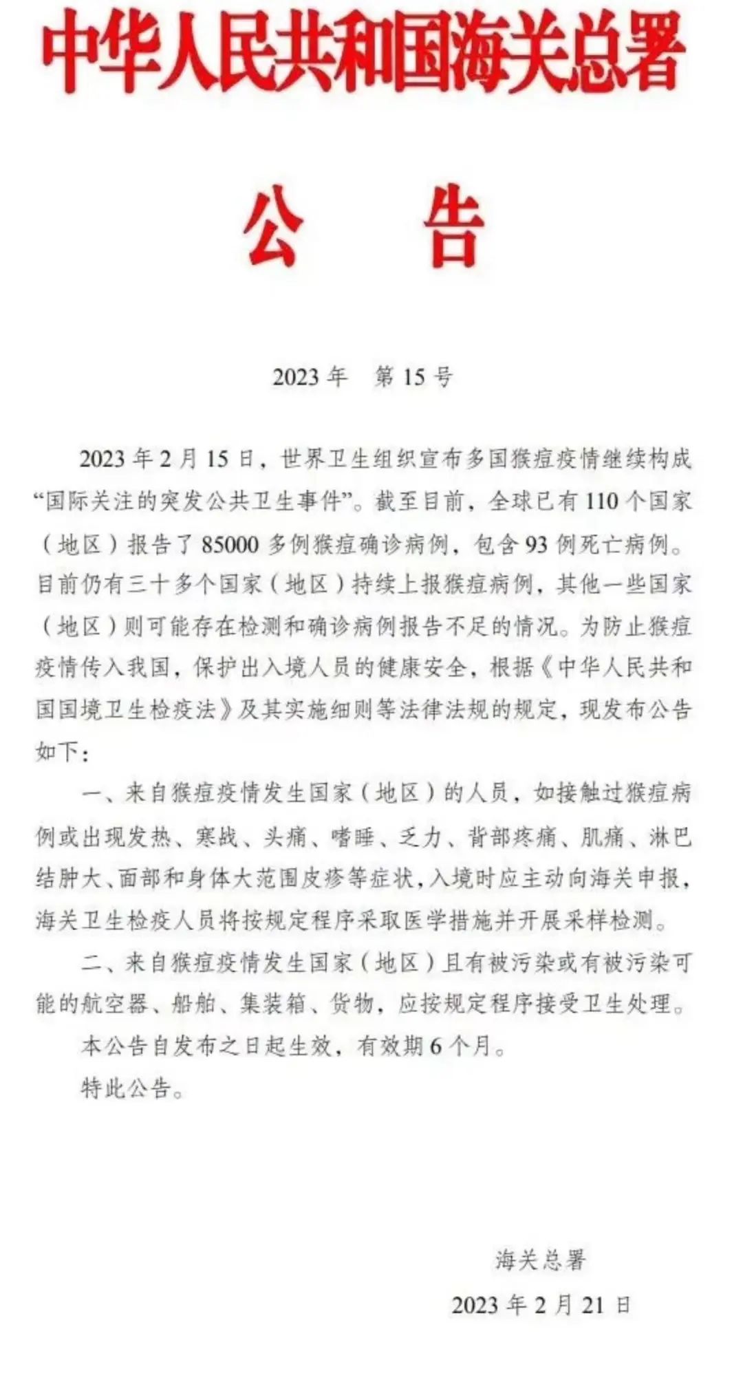2月22日,海关总署网站发布关于防止猴痘疫情传入我国的公告。