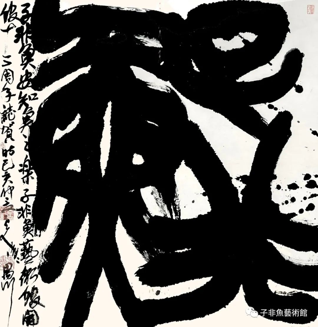 爱国从《大开通》中收获的,除了灵动错综的书写空间和自由的秩序,还有一种“字法”。对于现代书法创作来说,字法不只是结体,它更加本质。《大开通》隶书中参入篆意,结字简阔高古、外紧内松,通篇舒朗明豁。爱国从中深切体会到了“书法”和“字法”之间相互砥砺、彼此成就的关系。书家的每一次认真的书写,都是这个汉字的一次新生。在2019年的《草书苏轼诗轴》中,爱国将每个字都写得销魂荡魄,最后写到“草”之时,“书法”的现代意识自然发生。2020年的《醉》则走得更远,在“醉”字的解构和重构中,生出一种画意、一种字象——单字成象,酒酣耳热后的意气在画幅中弥漫洋溢。
