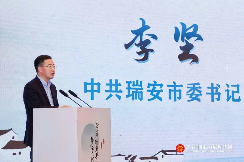 瑞安市委书记李坚在致辞中感谢上级部门对瑞安侨务工作的肯定和支持,介绍了瑞安市情并从“大侨务、大交流、大平台、大服务”四个方面阐述了瑞安在乡村振兴、共同富裕方面所做的工作。温州市委常委、统战部长汪驰在致辞中表示,温州将以此次全省现场会为推动,充分发挥温州侨务资源优势,进一步找准中心工作与侨务部门助力共同富裕的结合点,真心实意带动侨界助力共同富裕,大力促进同频共振、融合发展,在更高层次上打造具有温州辨识度和影响力的“侨助共富”品牌。