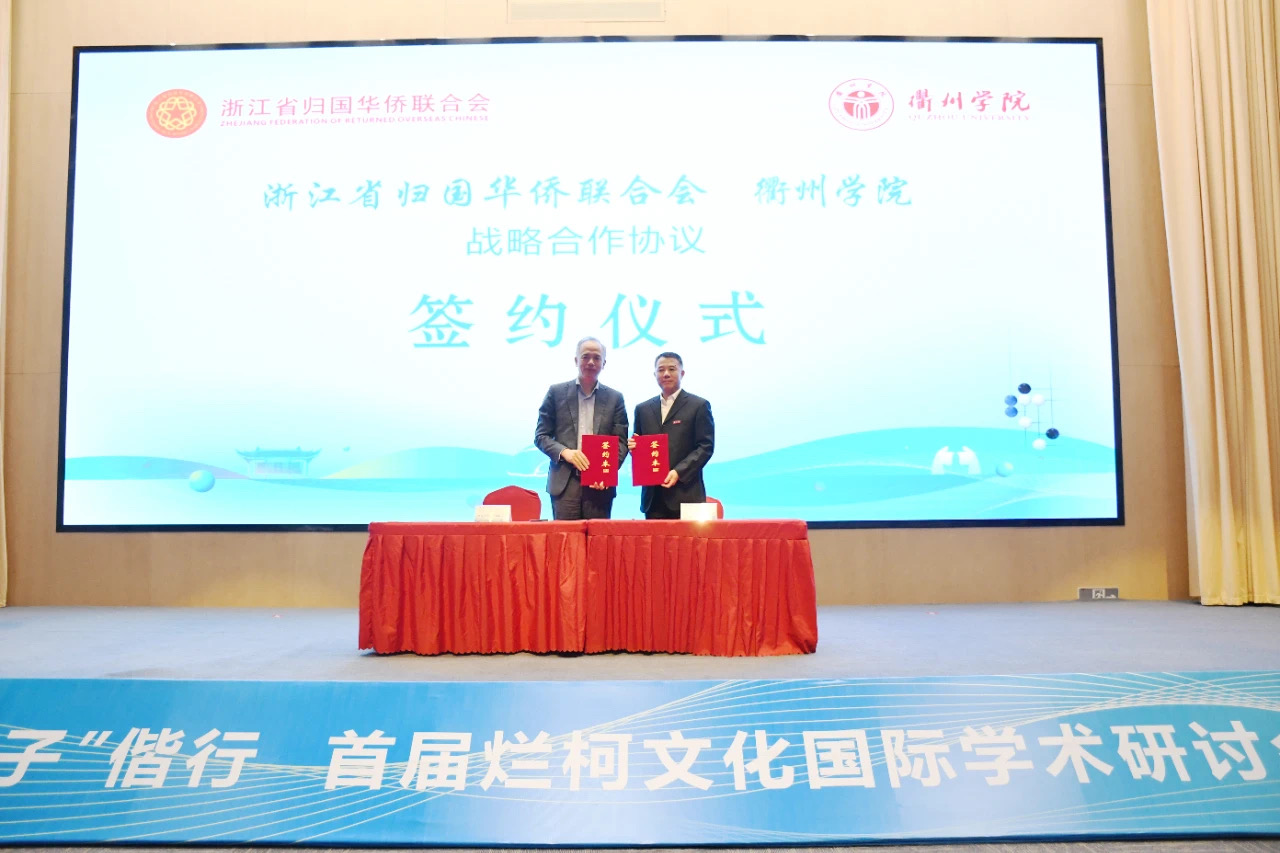 本次活动上,浙江省侨联与衢州学院签订战略合作协议,浙江省侨联副主席周松一和衢州学院党委副书记杨政上台签约。