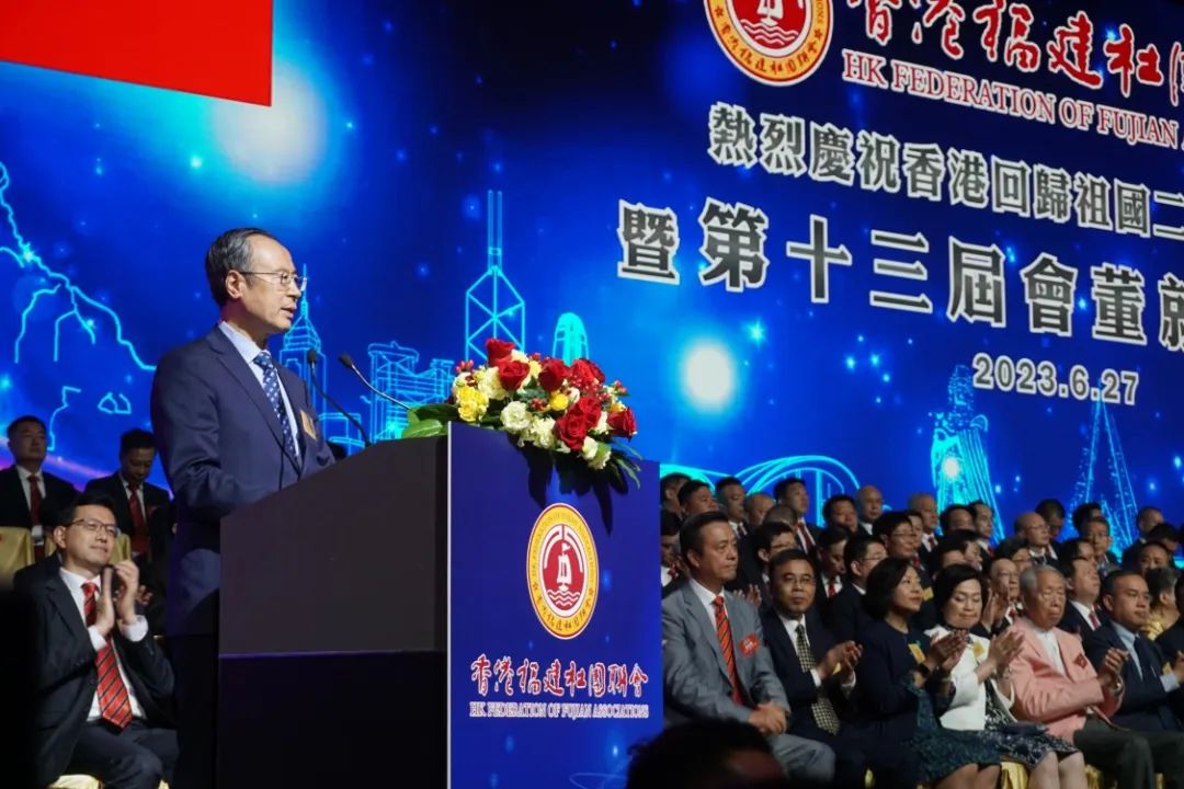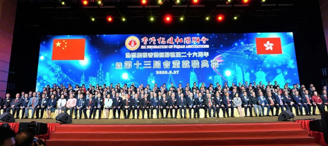 香港福建社团联会庆祝香港回归祖国26周年暨第十三届会董会就职典礼于27日晚在香港会展中心举行。香港特区行政长官李家超,福建省委书记、省人大常委会主任周祖翼,中央政府驻港联络办主任郑雁雄,中国侨联党组书记、主席万立骏,香港福建社团联会常务会董及香港各界人士等近2000人出席典礼。
