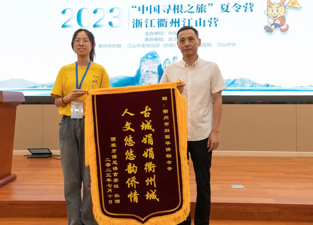 马伟民为营员代表授营旗,西班牙博思语言学校致赠锦旗。
